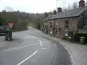 ![]() Whatstandwell corner on the A6 road main road looking North where it turns across the Derwent bridge in an 'S' bend to left then right. | |