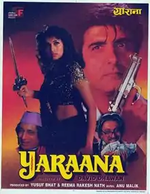 Yaraana (transl. "Friendship") is a 1995 Bollywood romantic thriller film directed by David Dhawan and starring Madhuri Dixit, Rishi Kapoor, Raj Babbar, Kader Khan and Shakti Kapoor.[3][4] It is loosely based on the American film Sleeping with the Enemy, starring Julia Roberts.[5] The film is known for the hit song "Mera Piya Ghar Aaya".[6]